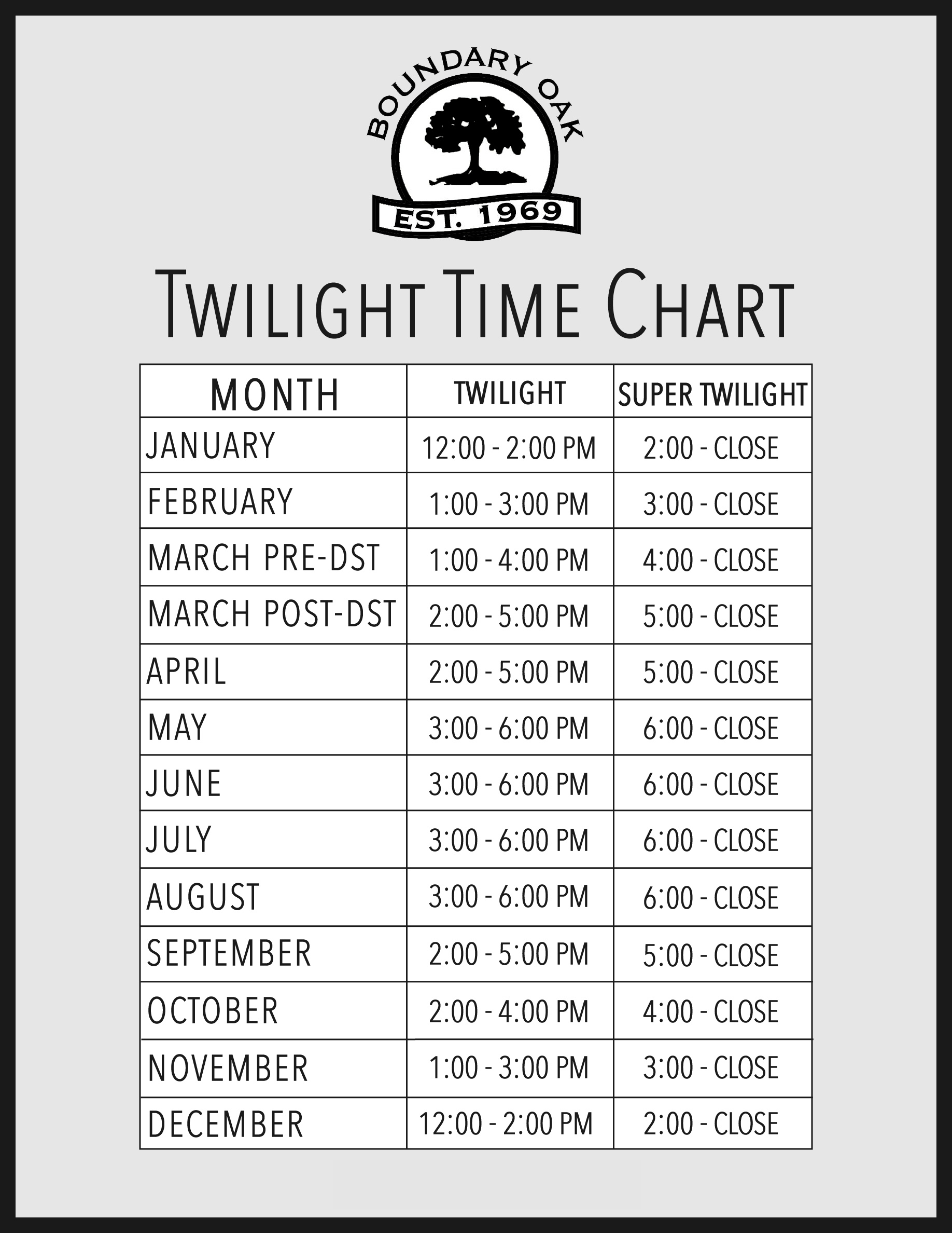 | Off-Peak Rates | Twilight | Student (9-Holes / 18-Holes) | Early Bird (Back 9) | Late Bird (Super Twilight) |